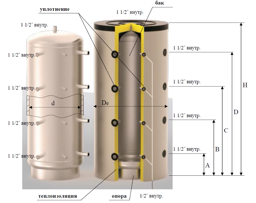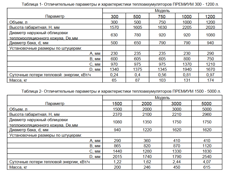 Конструктивно теплоаккумуляторы ТЕПЛОВЪ ПРЕМИУМ выпускаются в двух модификациях по пространственному расположению штуцеров: −модели ПРЕМИУМ с разнесенным радиальным расположением, см. рисунки 1, 2, таблицы 1,2;−модели ПРЕМИУМ В с линейным вертикальным расположением, см. рисунки 3,4, таблицы 3,4.