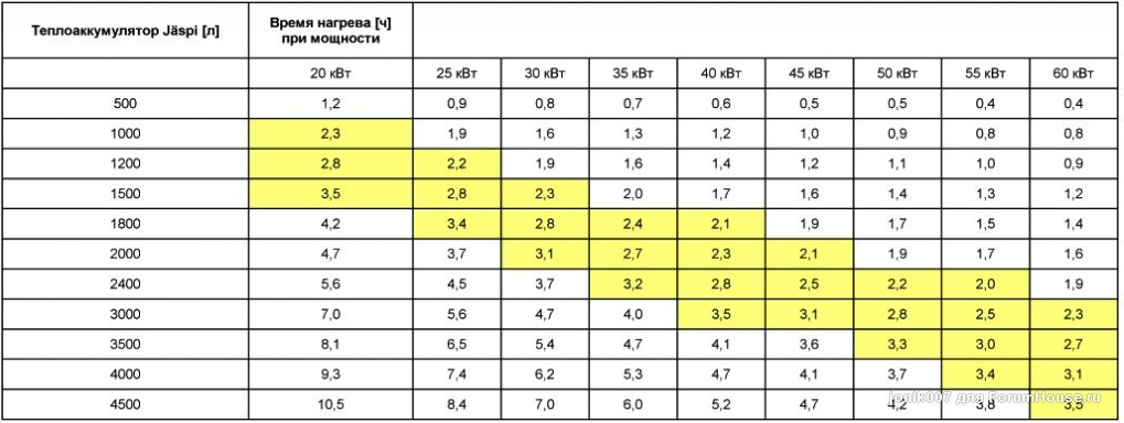 В первую очередь объем бака-аккумулятора зависит от мощности котла. Теплоаккумулятор нужно выбирать так, чтобы времени горения одной полной загрузки (2-3,5 ч) было достаточно для нагрева теплоаккумулятора примерно на 40°C. При этом достигается наилучший кпд котла и оптимальное количество загрузок топлива в сутки (1-2 загрузки дров в сутки в морозную погоду). В таблице представлено время зарядки от котлов разной мощности (значения-ориентиры). В диапазоне желтого цвета - рекомендуемые время горения и объем теплоаккумулятора.