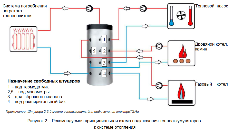 Принцип действия теплового аккумулятора заключается в том, что в процессе работы котла часть его энергии направляется на нагрев теплоносителя, находящегося в утеплённом баке.
