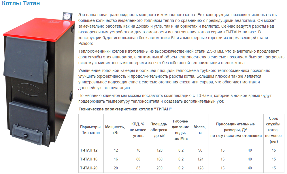 Твердотопливный. Может быть оборудован с ТЭНами, которые в ночное время будут поддерживать температуру теплоносителя и создавать дополнительный уют. Теплообменник стальной 3мм. Масса - 128кг. Площадь обогрева до 200м2