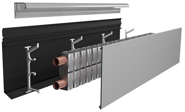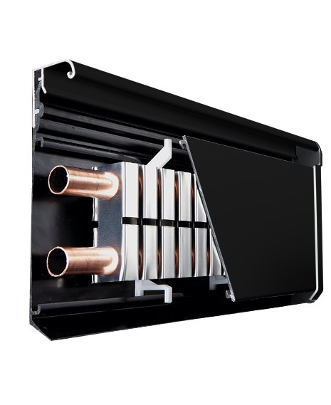 Применение в теплообменнике металлов с высоким коэффициентом теплоотдачи (медь и анодированный алюминий) позволяет эффективно использовать теплый плинтус даже в низкотемпературных системах отопления, к примеру при подключении от теплового насоса. Лицевая и верхняя часть корпуса изготовлены из ударопрочного алюминиевого профиля, обеспечивающего высокую равномерную теплоотдачу по всей длине греющей системы.