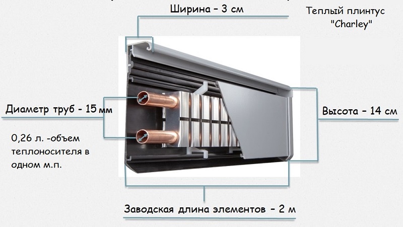 Водяной теплый плинтус «Charley» состоит из теплообменника и алюминиевого корпуса. Теплообменник плинтуса выполнен из медных трубок, на которых методом дорнования зафиксирована алюминиевая лента с ламелями. Данная лента представляет собой змейку одинарную в стандартном варианте (мод. Стандарт) и двойную с увеличенной мощностью (мод. Пауэр). Уникальность конструкции «Charley» состоит в том, что во время цикла нагрева/остывания, так называемом линейном расширении металла греющей части, в системе не происходит щелчков и других посторонних звуков, что иногда встречается у продукции других производителей.