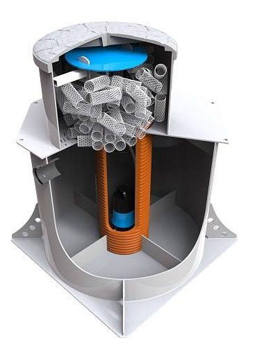 На перекрытии основного резервуара, перекрытии насосной шахты и крышке технологического отверстия расположен наполнитель камеры аэрации — отрезки полиэтиленовой сетчатой трубы.