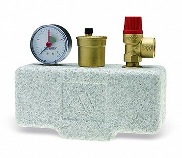 - Включает в себя предохранительный клапан, автоматический воздухоотводчик (с запорным клапаном) и манометр, смонтированные на стальной консоли.