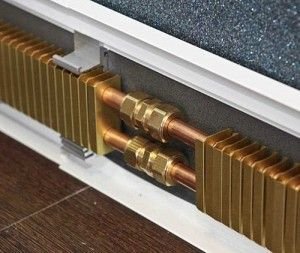 Теплый плинтус водяной в жидкостном варианте. По медным трубам циркулирует теплоноситель.