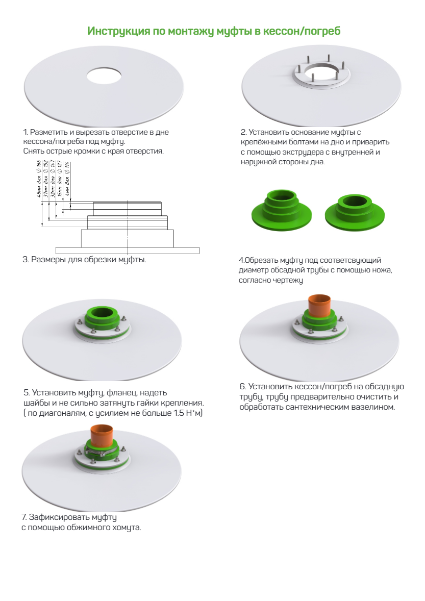 Муфта обеспечивает герметичное соединение кессона с оголовком скважины диаметром обсадной трубы от 100 мм до 166 мм.