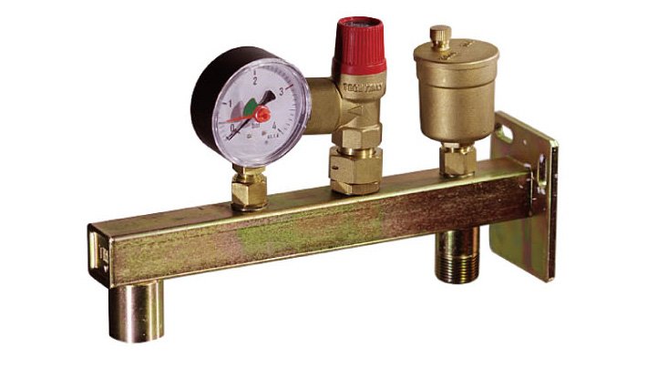 - Включает в себя предохранительный клапан, автоматический воздухоотводчик (с запорным клапаном) и манометр, смонтированные на стальной консоли.