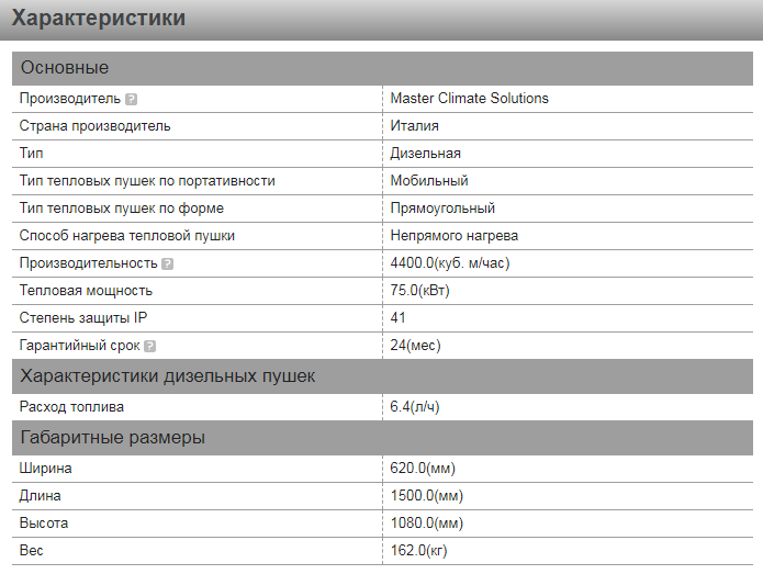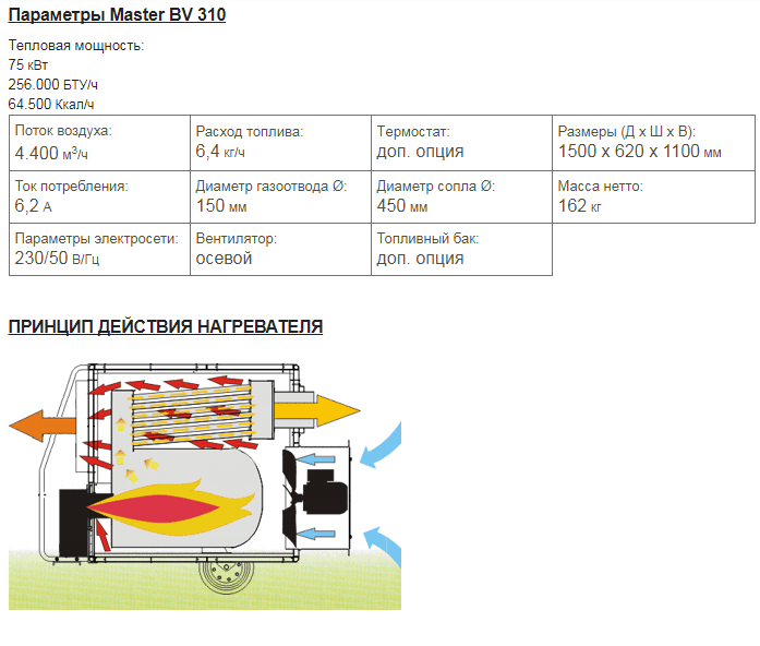 Тепловая мощность:75 кВт, 256.000 БТУ/ч, 64.500 Ккал/ч. Поток воздуха:4.400 м3/ч 6,4 кг/ч/