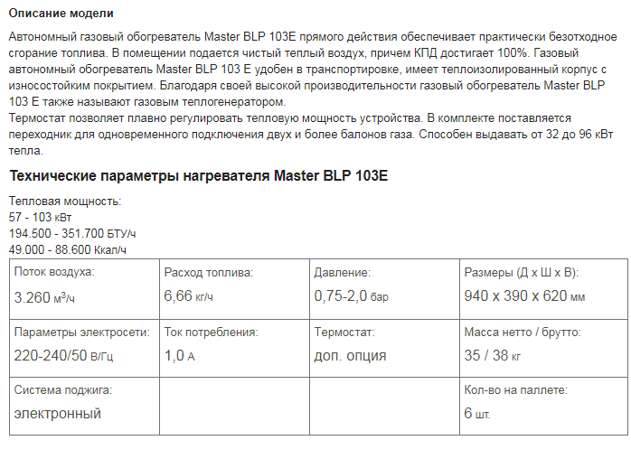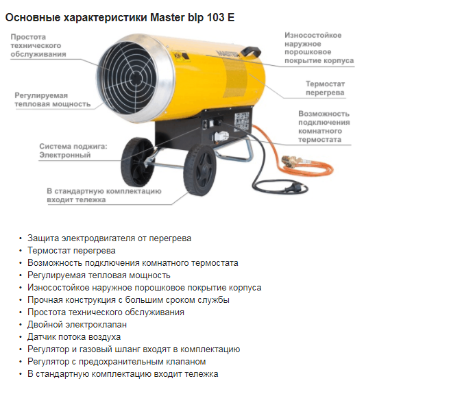 Газовая тепловая пушка Master BLP 100 E обеспечивает бездымное сгорание топлива и отсутствие запаха Плавная регулировка мощности нагрева Моментальная готовность к работе Обладает КПД близким к 100%.