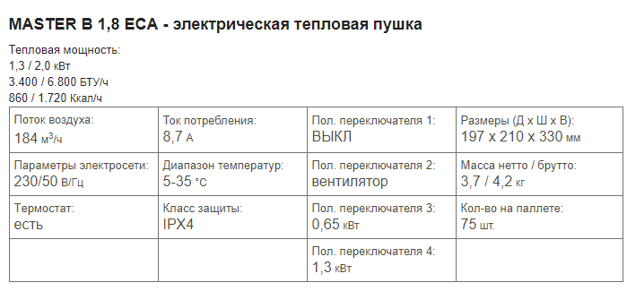 MASTER B 1,8 ECA - электрическая тепловая пушка.