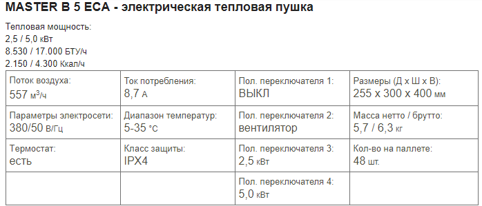 Лаборатория света и тепла » Отопительное оборудование » Тепловые пушки, горелки и нагреватели » Электрические нагреватели с вентиляторами » Электрическая тепловая станция MASTER B 5 ECA