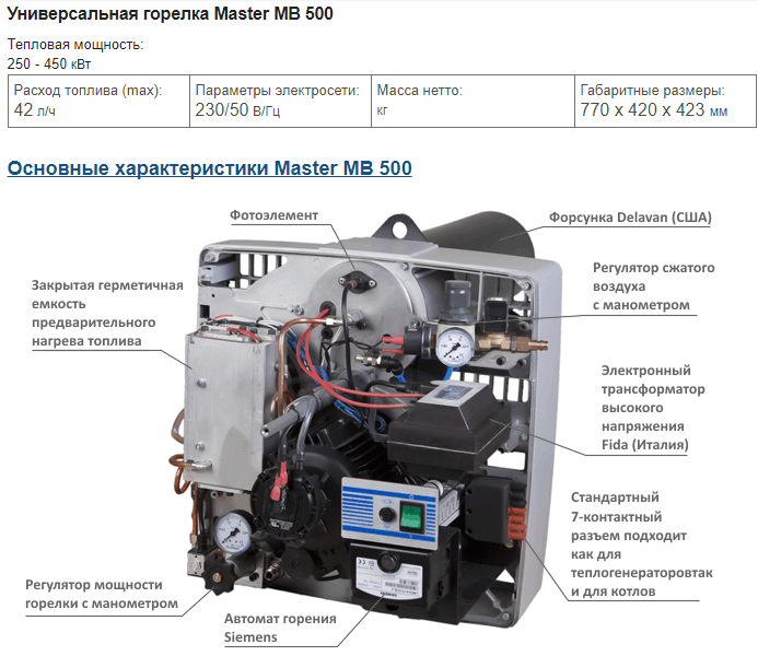 Лаборатория света и тепла » Отопительное оборудование » Тепловые пушки, горелки и нагреватели » Горелки на отработанном масле и универсальные » Универсальная горелка Master MB 500