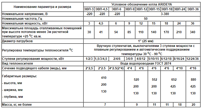 Котлы серии ЭВП: диапазон мощности от 3 до 36 кВт, регулировка температуры теплоносителя с помощью термостата в диапазоне от 30 до 90°C, три ступени мощности, колодка для подключения датчика температуры или модуля GSM, защита от перегрева. Гарантия — 1 год.
