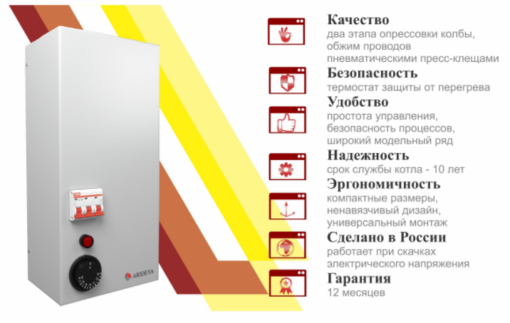 При производстве котла особое внимание уделяется качеству изделий. Проверка качества осуществляется на каждом этапе производства. ARIDEYA ЭВП - надежный, экономичный, компактный, простой в эксплуатации и монтаже, современный, безопасный электрический котел. Для усиления безопасности эксплуатации котел оснащается автоматической защитой и эффективной изоляцией.