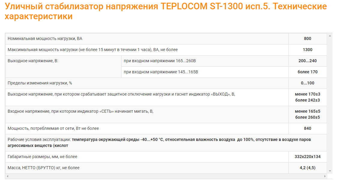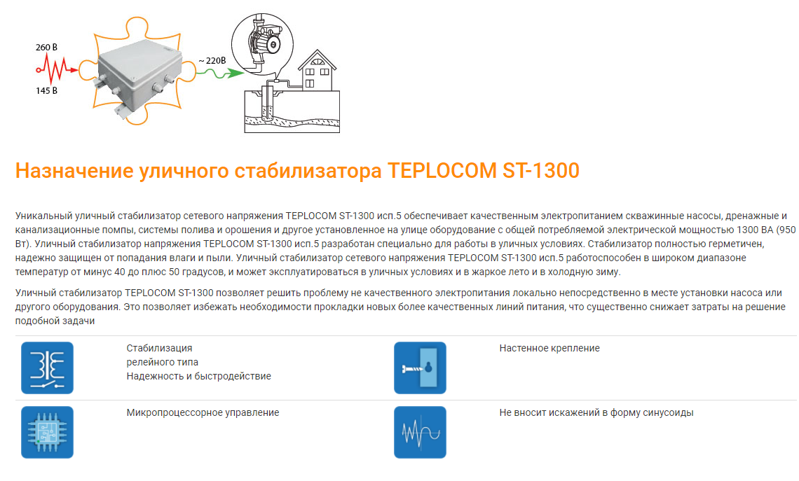 Стабилизатор напряжения уличного исполнения. Мощность нагрузки 1300 ВА. Уникальный стабилизатор напряжения для установки на улице, в пылевлагозащищенном корпусе. Класс защиты IP56. Обеспечивает качественным электропитанием скважинные насосы, дренажные и канализационные помпы, системы полива и орошения, и другое оборудование, установленное на улице с общей потребляемой электрической мощностью 1300 ВА (950 Вт). Полная мощность во всем диапазоне сети, стабилизация напряжения вольтдобавочного типа, микропроцессорное управление, защитное отключение при авариях в сети с автоматическим восстановлением, индикация аварийных ситуаций. Диапазон температур окружающей среды от -40 °C до +50 °C. Пластиковый корпус, сальниковые вводы, индикация режимов работы