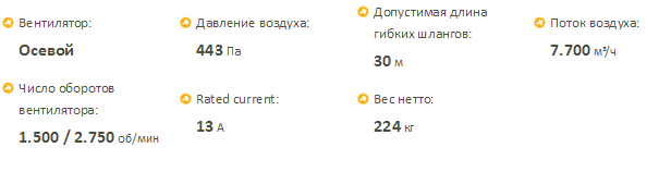 Тепловая мощность:75 кВт, 256.000 БТУ/ч, 64.500 Ккал/ч. Поток воздуха:4.400 м3/ч 6,4 кг/ч/